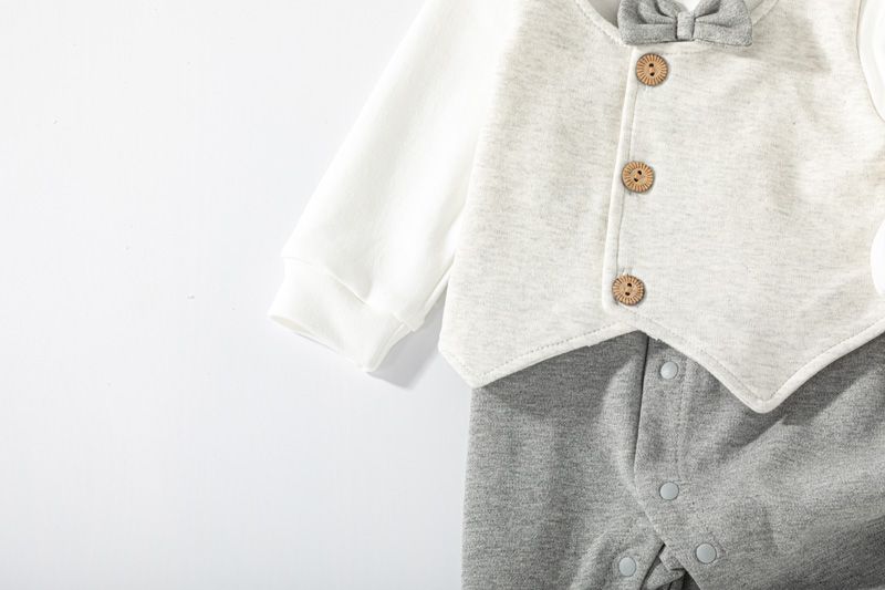 上品な蝶ネクタイとベスト風の前面デザインが目を引く、フォーマルな雰囲気たっぷりの男の子のベビードレス。