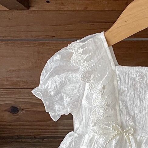 細やかな花柄レースと腰元のパール調アクセントが、赤ちゃんをまるで小さなプリンセスに。