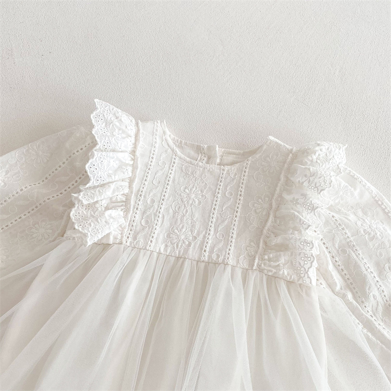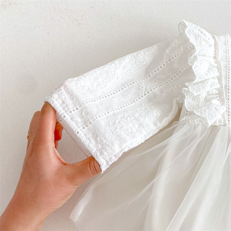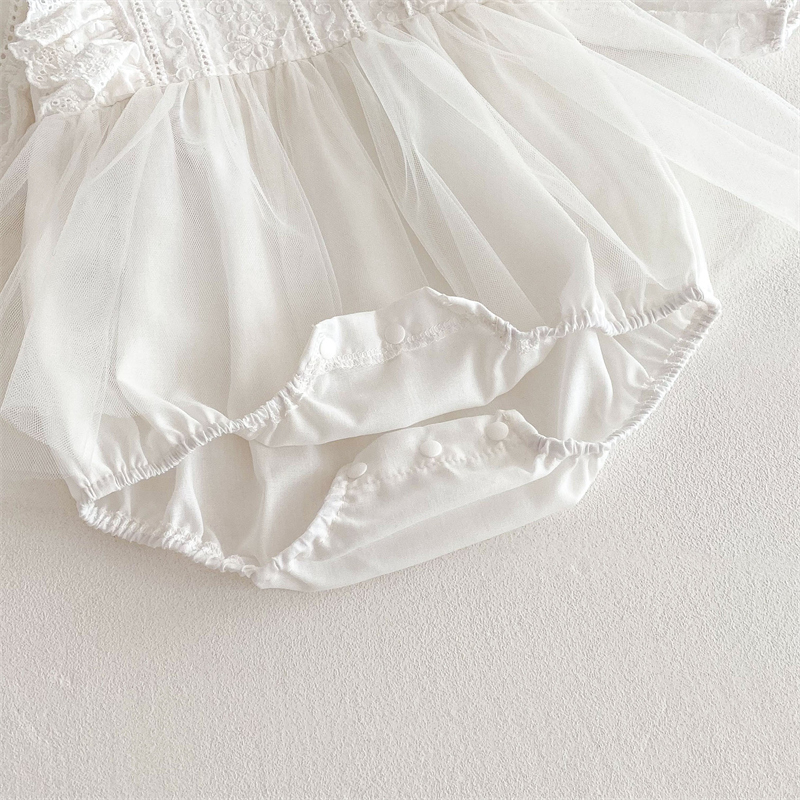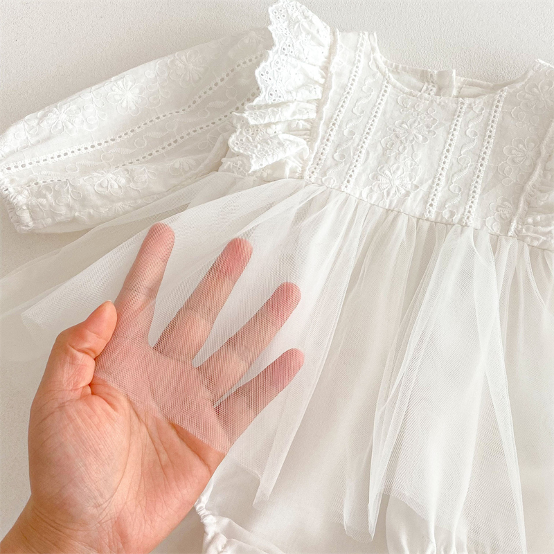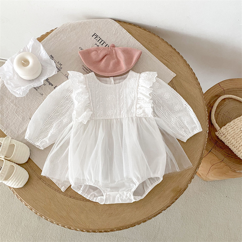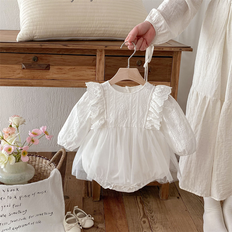 上品なレース刺繍とふんわり袖が可愛いベビードレスロンパースです。 綿95%・ポリウレタン5%の優しい素材で赤ちゃんの肌にも安心。 サイズは66~90センチまで対応し、特別な日にぴったりの一着です。 結婚式やお宮参りなど、大切な記念日を華やかに彩ります。