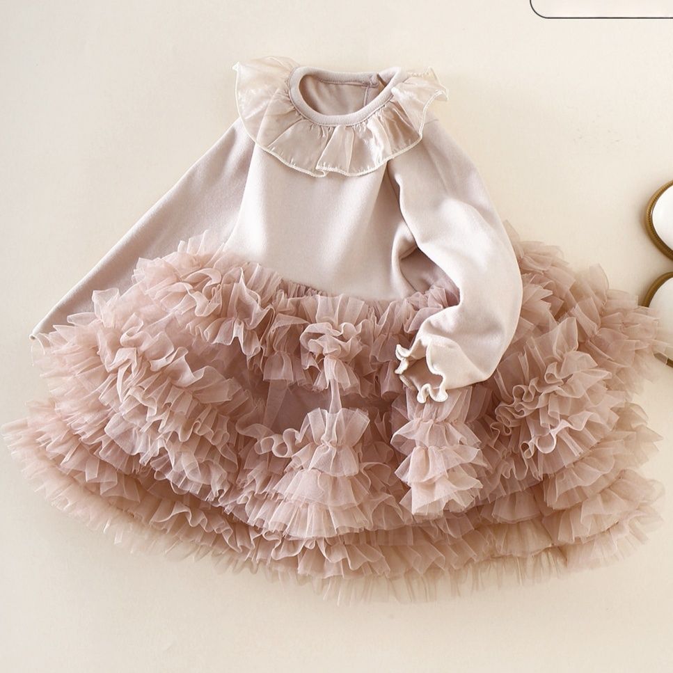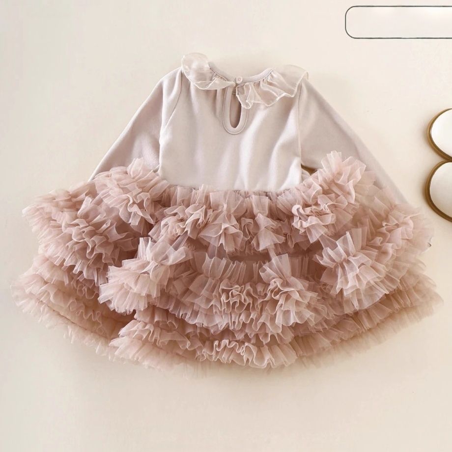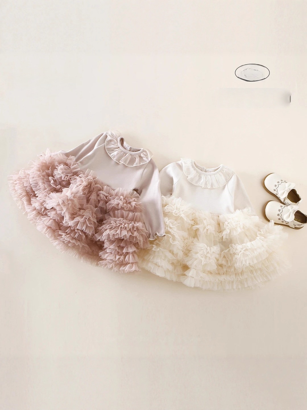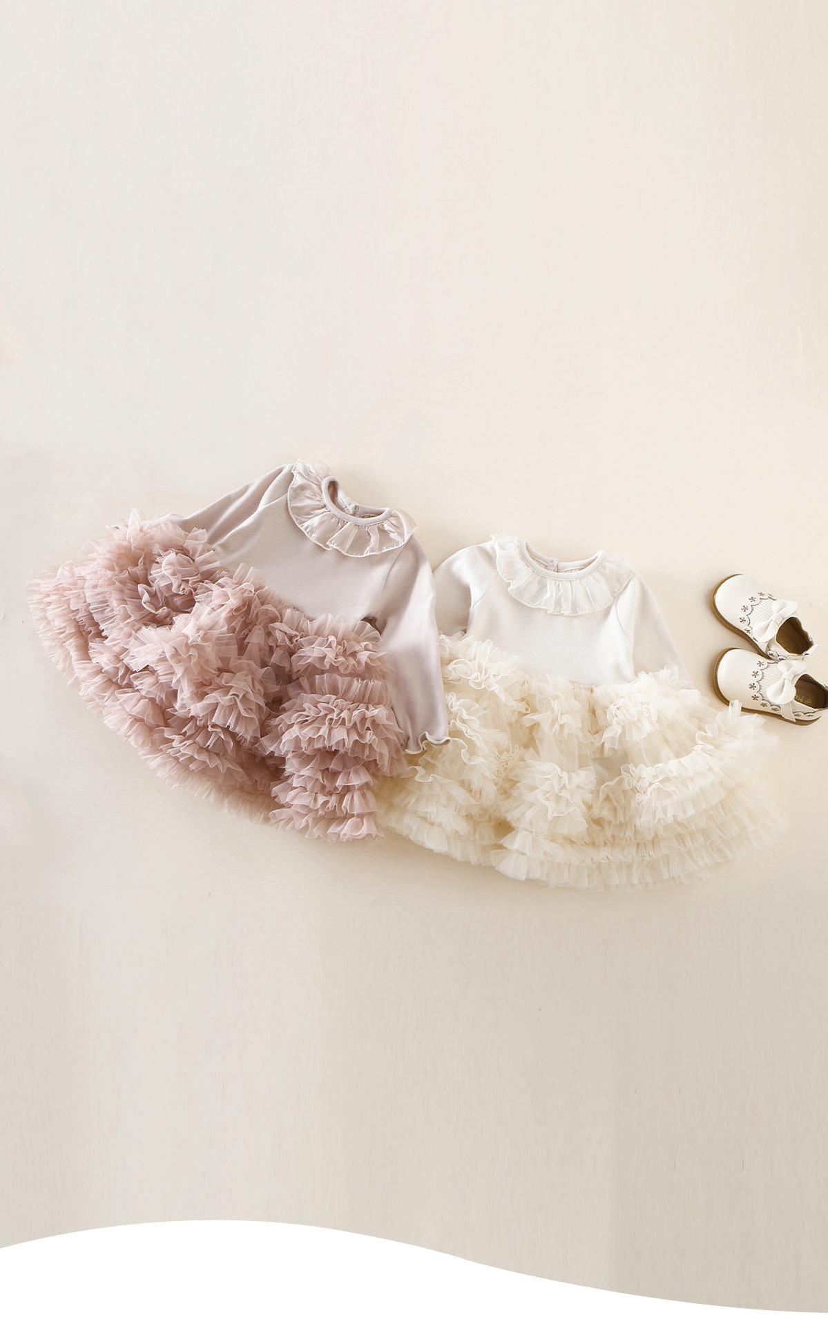 上品なフリル襟と華やかなチュチュスカートが特徴的なベビードレスです。 特別な日にぴったりの豪華なデザインで、お子様を可愛らしく演出します。 柔らかな素材で着心地も抜群、記念日の写真映えも間違いなしの一着です。