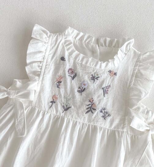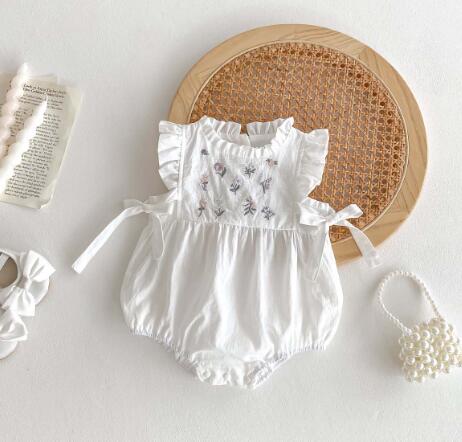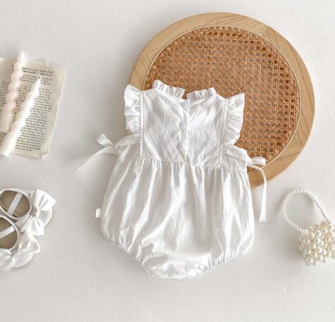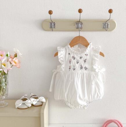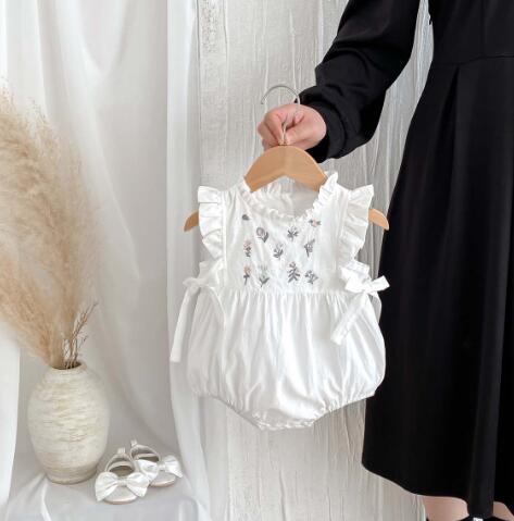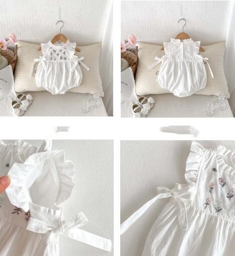 上品な白色のベビードレス風ロンパースです。 可愛らしいフリル袖と花柄刺繍が特徴的で、お食い初めなどの特別な日にぴったり。 韓国風デザインで写真映えも抜群です。 柔らかな素材でお子様も快適に過ごせます。
