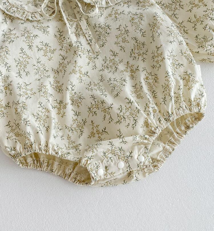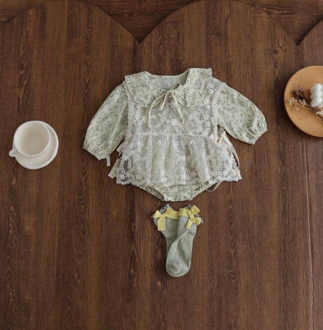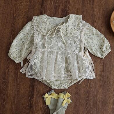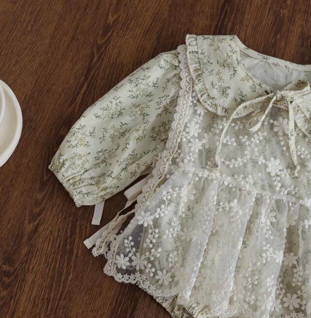 上品な花柄レースが美しいベビードレスロンパースです。 襟元のリボンデザインがとても可愛らしく、特別な日にぴったり。 柔らかな素材で赤ちゃんの肌に優しく、動きやすさも抜群です。 結婚式などの記念日やお出かけにおすすめの一着です。