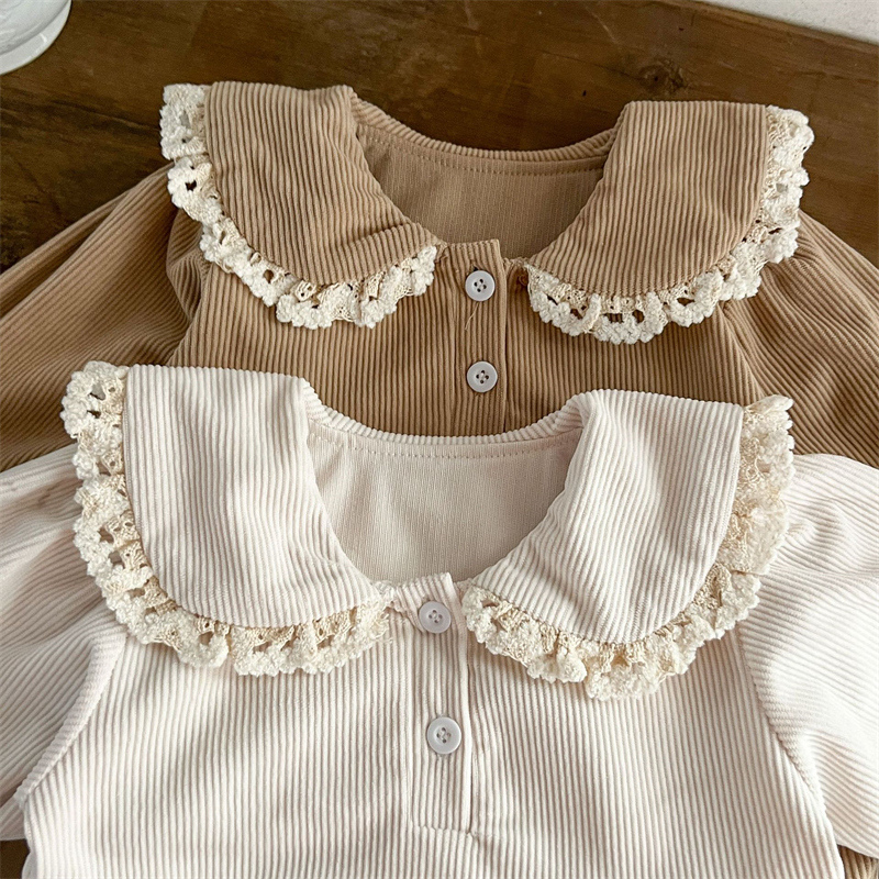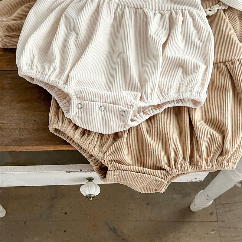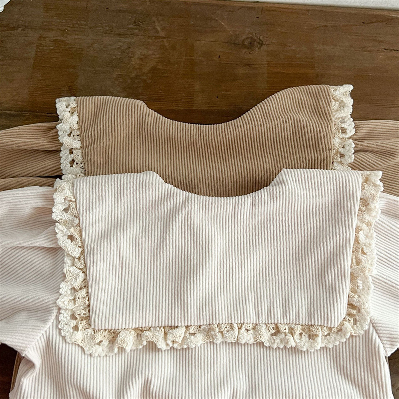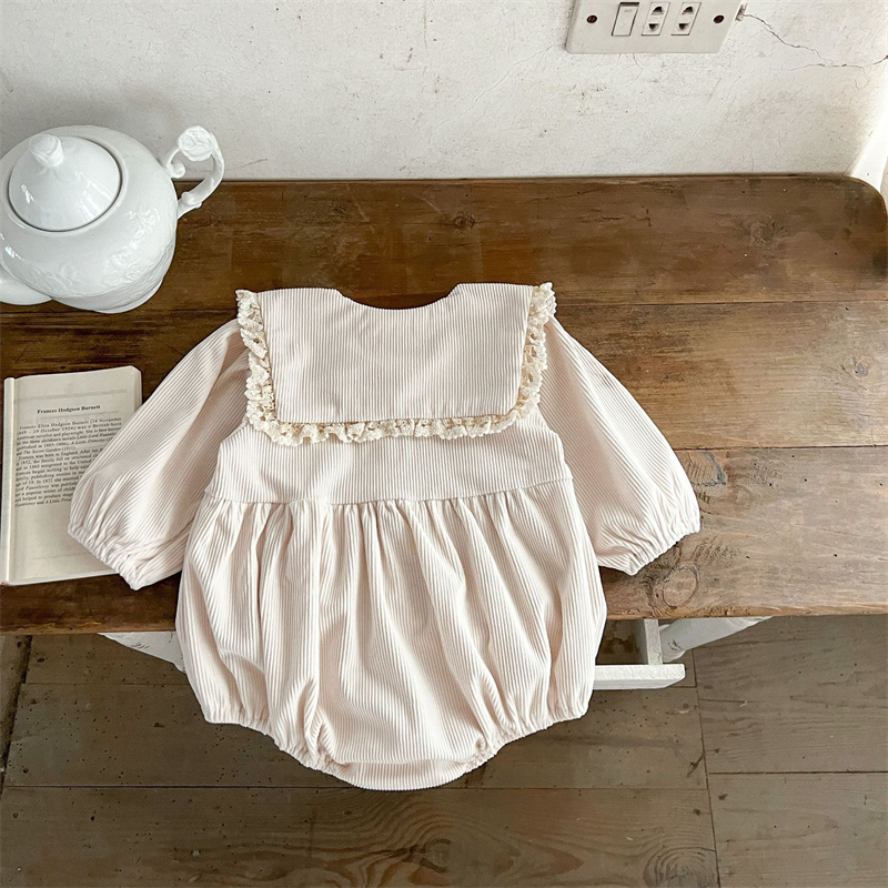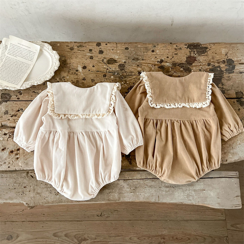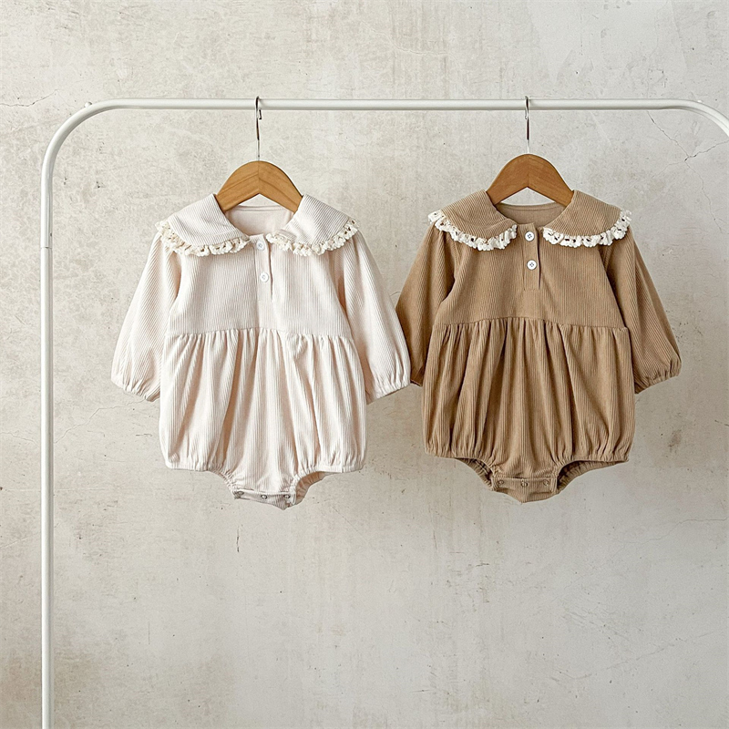上品なピーターパン襟とレース装飾が可愛いベビードレス風ロンパースです。 柔らかなコーデュロイ素材で赤ちゃんの肌に優しく、お宮参りやお食い初めなどの特別な日にぴったり。 素材:綿100% カラー:ベージュ、ブラウン サイズ:66~100センチ