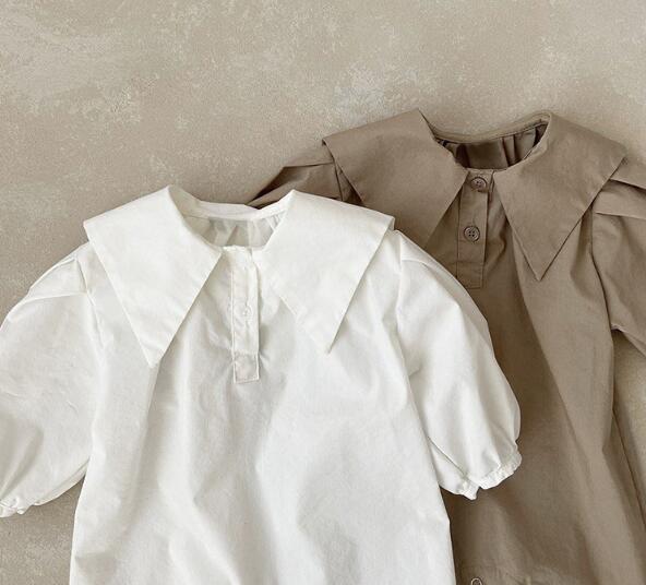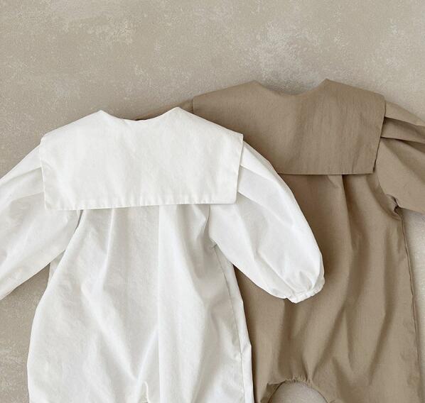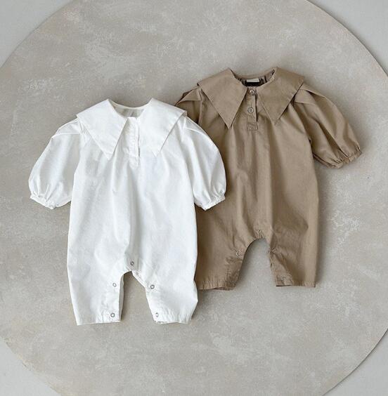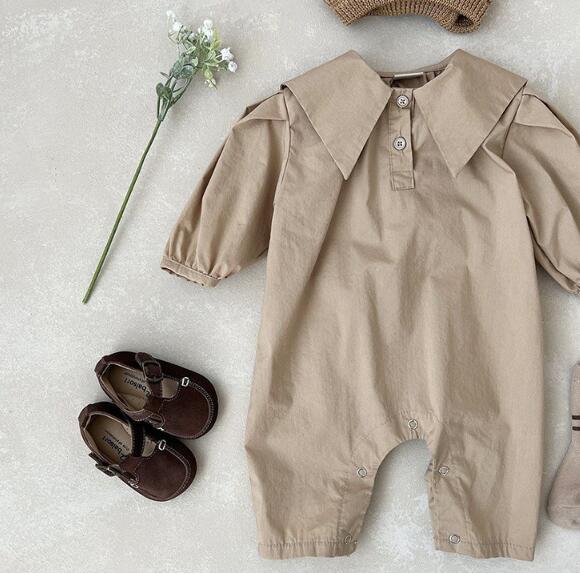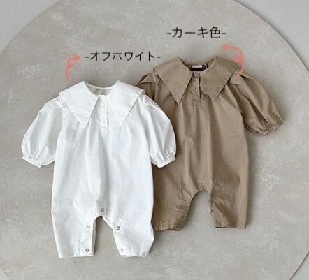 上品な襟付きデザインのベビーロンパースです。 白とベージュの2色展開で、どちらも洗練された印象を与えます。 ベビードレスとしても活用でき、特別な日の装いにぴったり。 66-90センチサイズで長くご愛用いただけます。
