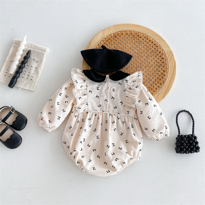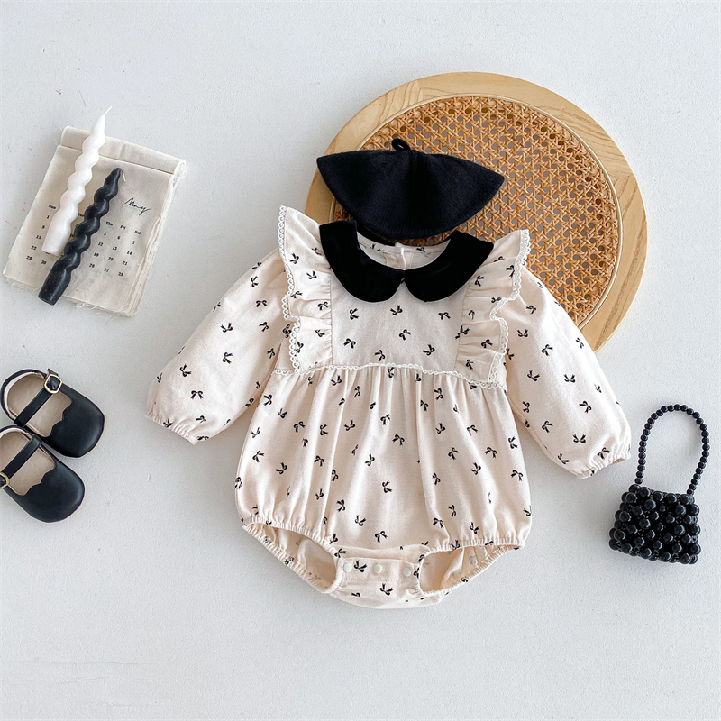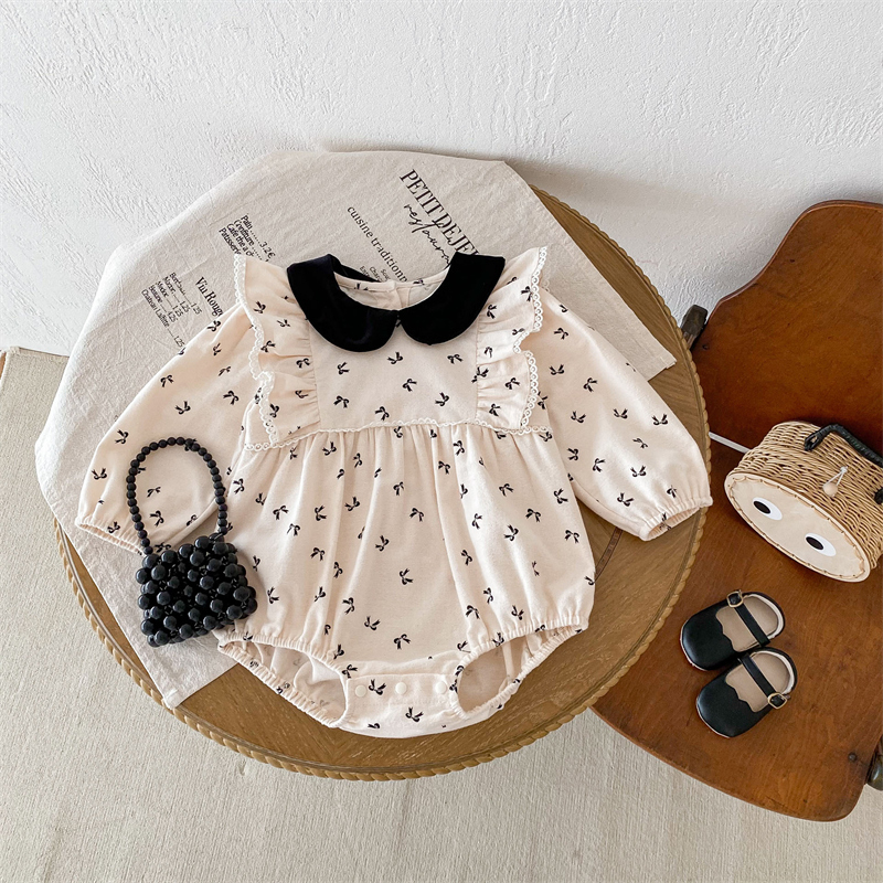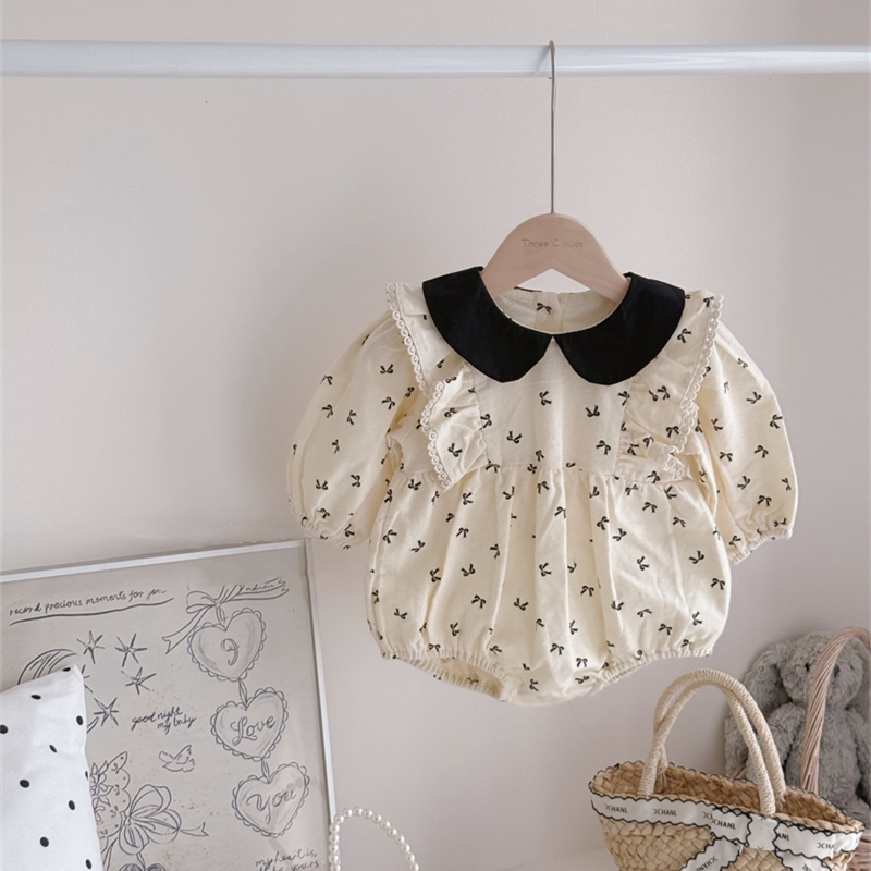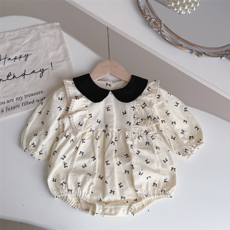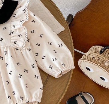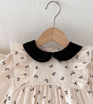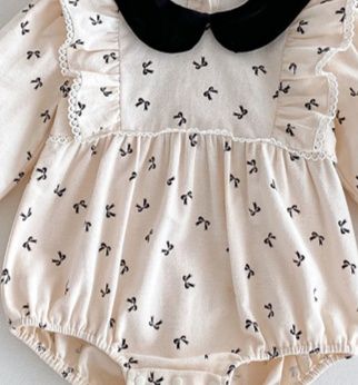 上品な丸襟デザインとリボン柄が可愛らしいベビードレス風ロンパースです。 素材は綿100%で赤ちゃんの肌に優しく、春秋シーズンに最適。 袖口のレース装飾とパフスリーブが女の子らしい華やかさを演出します。 サイズは66~90センチメートルまで対応しています。