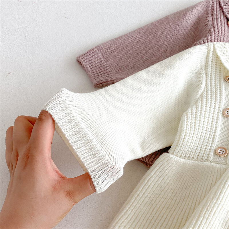 上品な丸襟デザインが特徴的なベビードレス風ニットロンパースです。 素材:綿95% ポリエステル5% カラー:オフホワイト、ダークピンク サイズ:66~100センチメートル お出かけや記念日にぴったりの可愛らしい一着です。