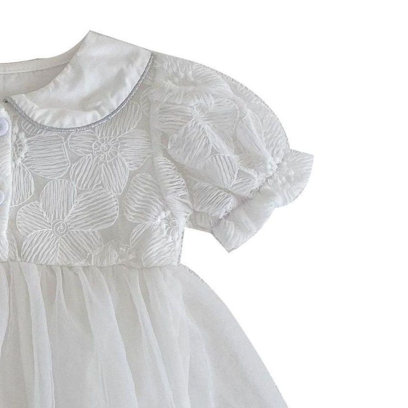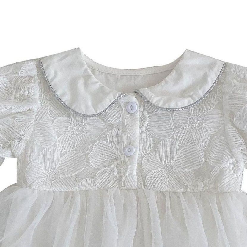 上品な花柄刺繍が美しい白色のベビードレスです。 ふわりと広がるチュールスカートと丸い襟がとても可愛らしく、 特別な日にぴったりのベビードレスです。 連体服タイプで着脱も簡単です。