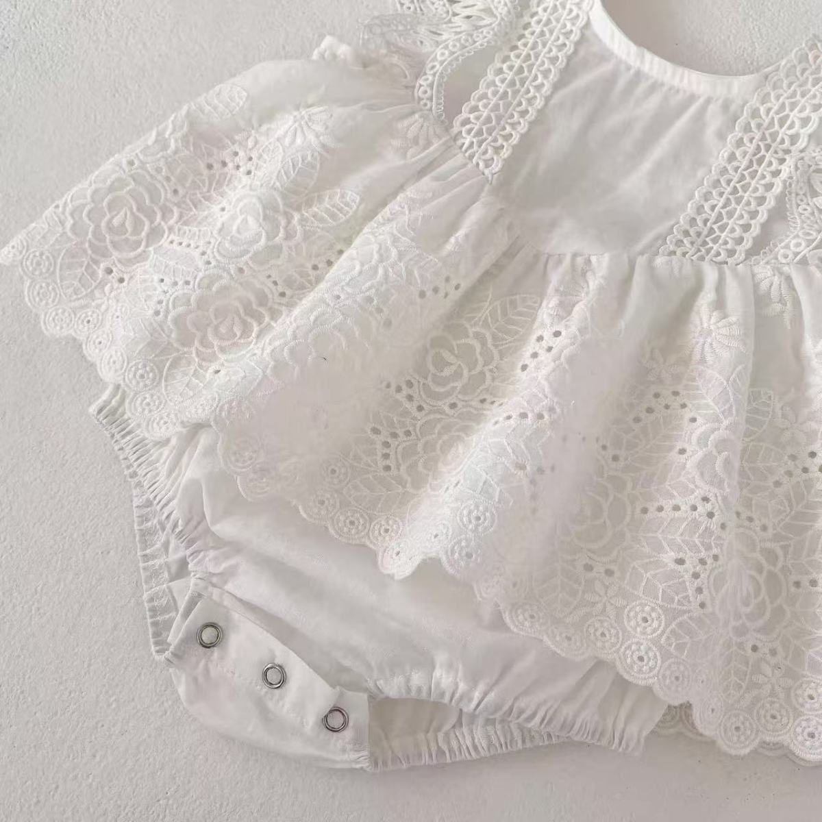 繊細な花柄総レースが上品な印象を与える退院用ベビードレスです。