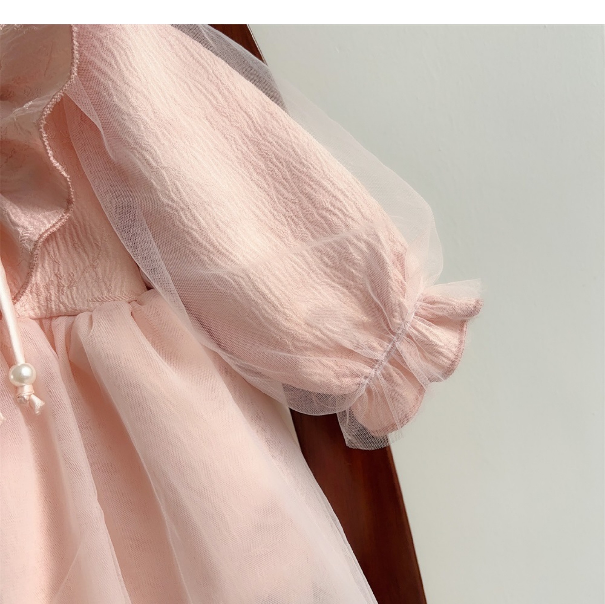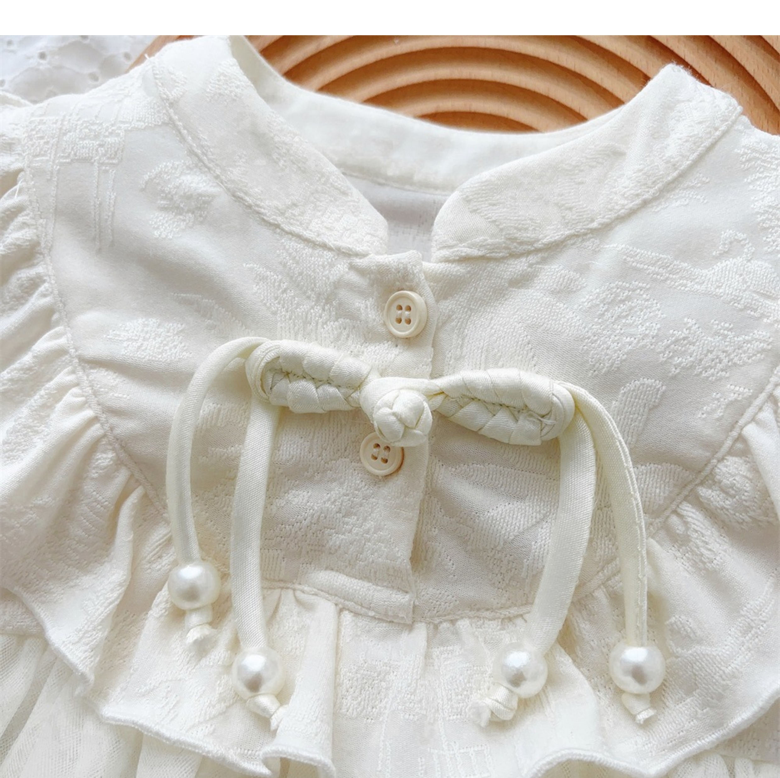 クラシックな雰囲気のあるチュールデザインと、ふんわりボリューム袖が特徴のロンパース型ベビードレス。まるで小さな童話の主人公のような愛らしさを演出してくれます。伝統的な可愛らしさをベースに、今っぽい抜け感もプラス。