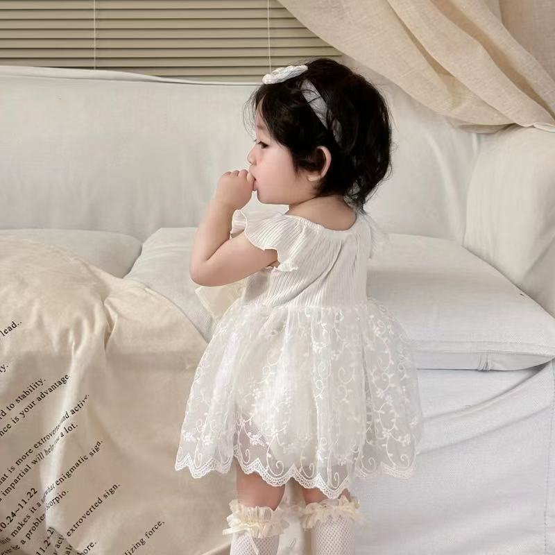 愛らしいフリル袖と繊細なレース刺繍が魅力的なベビードレスです。