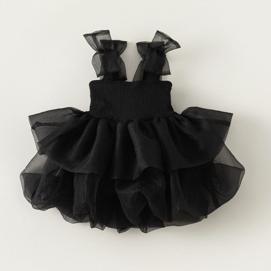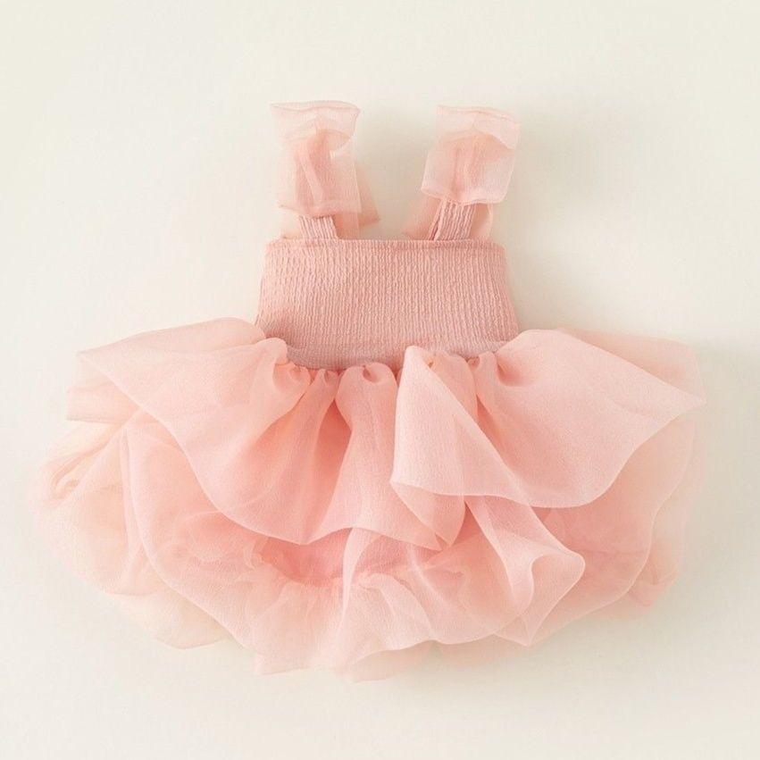 スカート部分には贅沢に重ねられたチュール素材のフリルが何層にも広がり、まるでお花のような華やかなシルエットを演出します。