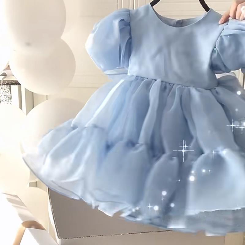 ボリューム感のあるパフスリーブと、ふわりと広がるチュール素材のスカートが愛らしい印象を演出します。