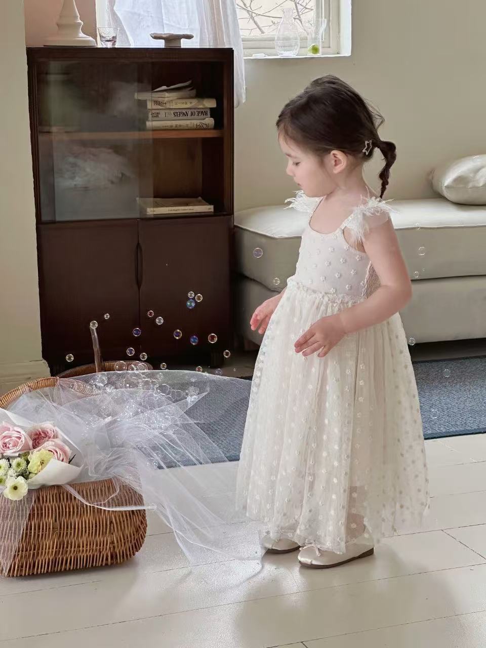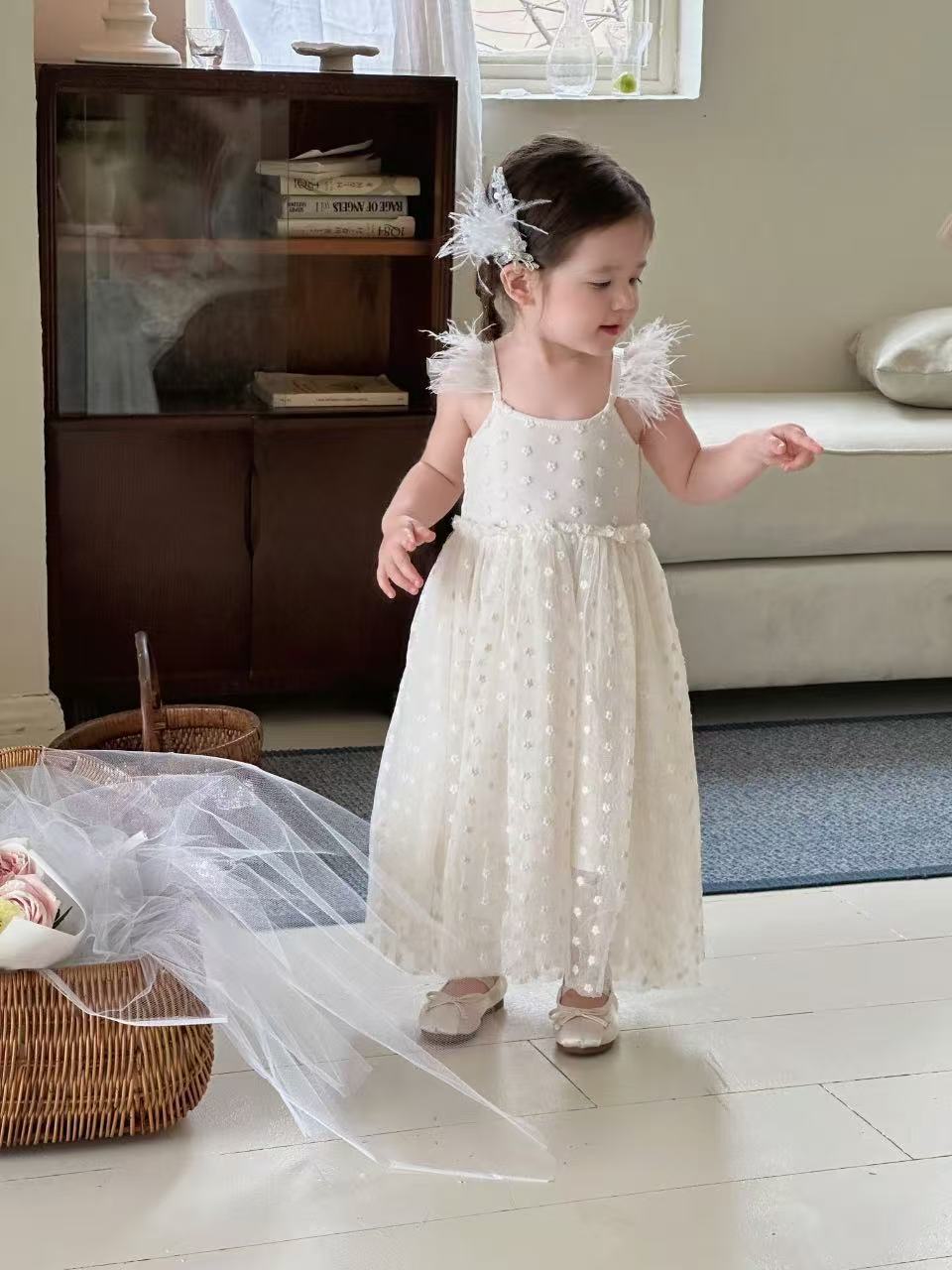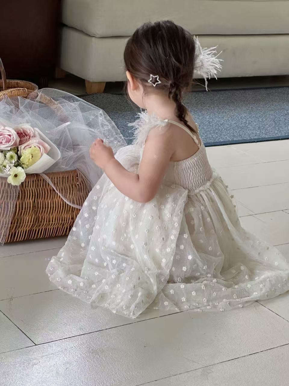 肩に施された羽根飾りが天使のような愛らしさを演出するベビードレスです。